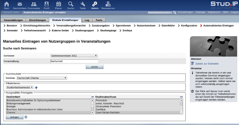 Auch die Möglichkeit, bestimmte Nutzergruppen (Studienfach, Einrichtung, Statusgruppe) in spezifischen Veranstaltungen (z.B. Fachschaften) einzutragen, wird häufig benötigt.