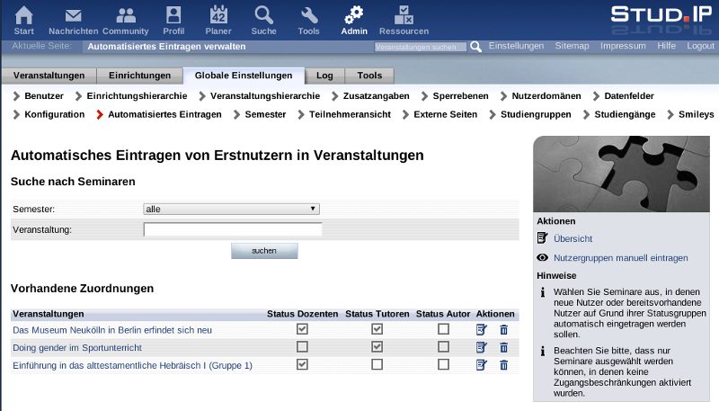 Das Hinzufügen bzw. Bearbeiten funktioniert nach den bekannten Vorgehensweisen in Stud.IP. Der Eintrag von neuen Nutzern erfolgt nur beim ersten Login. Trägt sich der Nutzer auf den normalen Weg wieder aus, wird er kein zweites Mal (automatisiert) eingetragen. Ändert ein Admin den Status eines Nutzers (z.B. von TUTOR auf DOZENT), werden Veranstaltungen, die für DOZENTEN eingestellt sind, berücksichtigt.