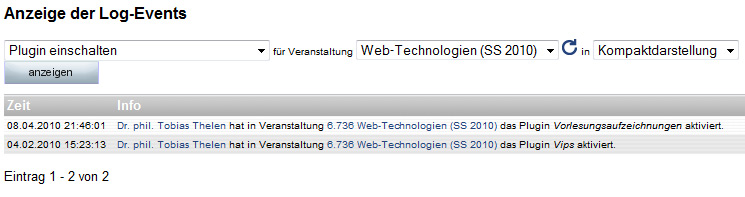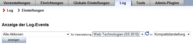 Die angezeigten Events sind chronologisch rückläufig sortiert, d.h. neuere Events stehen weiter oben. Bei mehr als 50 gefundenen Events werden die Ergebnisse paginiert, so dass jeweils 50 Events pro Seite angezeigt werden.