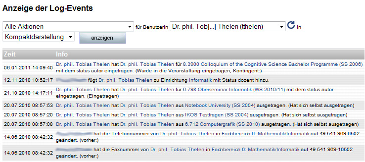 Die suche nach Personen-Events ermöglich kein umfassendes Tracking der Aktivitäten einer Person. Vielmehr sind vor allem Informationen über Veränderungen an den Basisdaten eines Accounts sowie Informationen über Einrichtungs- und Veranstaltungszuordnung zugänglich.