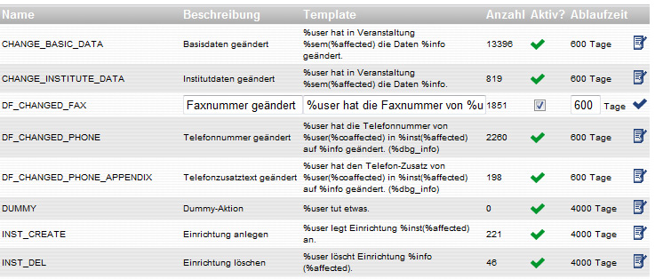 Der Edit-Knopf ganz rechts ermöglicht es, Beschreibung, Template, Aktivität und Ablaufdauer zu verändern. Hinweise: