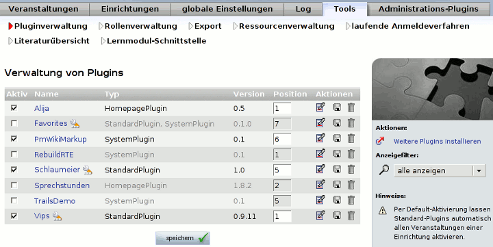 In der linken Spalte wird für jedes installierte Plugin angezeigt, ob es zur Zeit aktiviert ist. Dort kann das Plugin auch ein- oder ausgeschaltet werden. Auf der rechten Seite gibt es für jedes Plugin die Möglichkeit, eine Position festzulegen und verschiedene Aktionen auszuführen. Die Position gibt die Reihenfolge des Plugins in der Navigation - z.B. auf der Startseite oder in den Reitern einer Veranstaltung - an. Erlaubt sind hier nur Zahlenwerte größer als 0. Daneben gibt es noch die folgenden Aktionen: