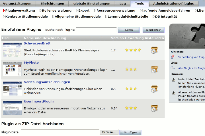Hier wird zunächst eine Liste von empfohlenen Plugins angezeigt, die bereits an vielen anderen Standorten eingesetzt werden. Weitere Plugins lassen sich mit Hilfe der Suchfunktion finden. Zu jedem Plugin wird jeweils ein Vorschaubild und eine kurze Beschreibung angezeigt. Durch einen Klick auf das Installations-Symbol wird das gewählte Plugin dann im eingenen Stud.IP installiert. Alternativ zur Auswahl aus der Liste und der Plugin-Suche kann auch ein Plugin als ZIP-Datei hochgeladen werden (wenn diese Funktion nicht deaktiviert wurde). Dazu gibt es unter der Liste der Empfehlungen ein ensprechendes Upload-Formular.