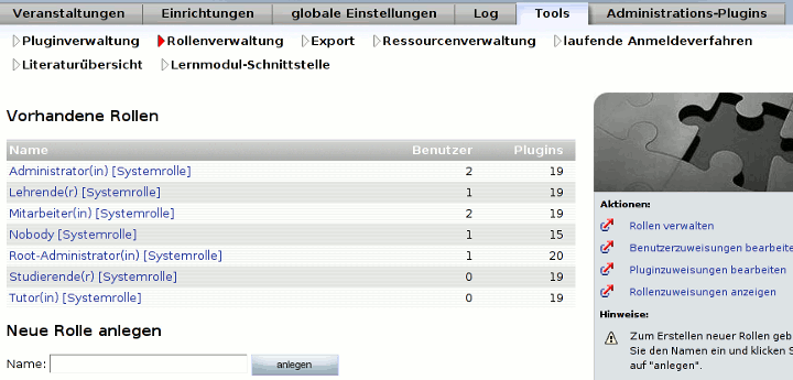 Für Plugins, die nur einer ganz speziellen, selbst zusammengestellten Nutzergruppe zugänglich sein sollen, gibt es die Möglichkeit, eine eigene Rolle zu erstellen (z.B. Evaluationsbeauftragte) und die Liste der Nutzer für diese Rolle zu bearbeiten. Dazu können auf der Übersichtsseite der Rollenverwaltung eigene Rollen angelegt und gelöscht werden. Diese können dann genauso wie die Systemrollen verwendet werden.