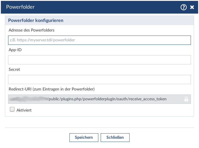 Nach der Installation und der Aktivierung des Plugins taucht im persönlichen Dateibereich der Nutzer (unter Profil -> meine Dateien) die neue Option "Powerfolder konfigurieren" auf. Nach dem Klick darauf öffnet sich der folgende Dialog:
