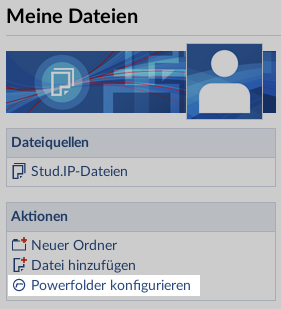 Zum Zugriff auf Powerfolder müssen Nutzer in ihrem persönlichen Dateibereich noch eine Freigabe einrichten, damit Stud.IP berechtigt ist, auf den persönlichen Teil des Powerfolder-Systems zuzugreifen. Hierzu wählt man in der Seitenleiste des persönlichen Dateibereichs die Aktion "Powerfolder konfigurieren" aus.