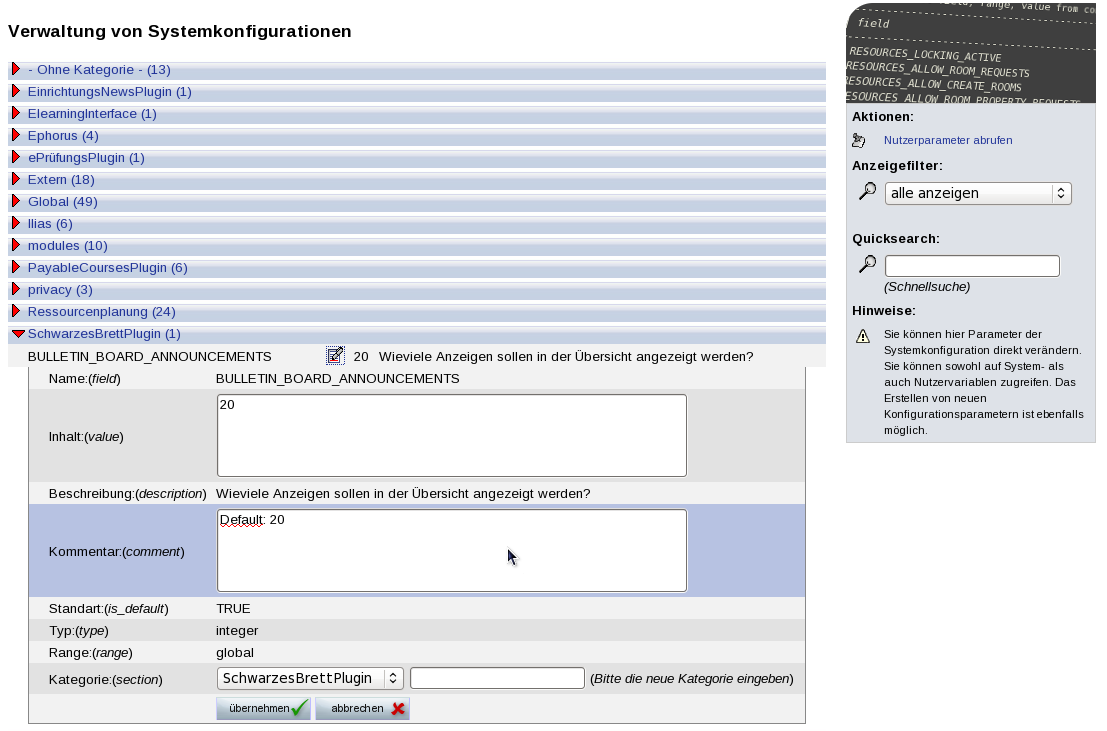Als Standardansicht erhalten Sie eine Übersicht (sortiert nach Katogieren) über alle vorhandenen Konfigurationsparameter die in der Tabelle config existieren.
