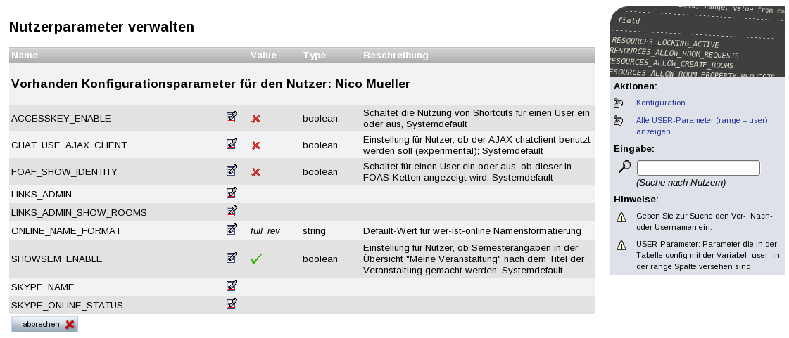 Hier habe Sie die Möglichkeit sich zentrale Konfigurationsparameter eines gewünschten Nutzers anzeigen zu lassen, um sie ggf. zu verändern. In der Infobox unter Alle USER-Parameter (range = user) anzeigen erhalten Sie eine Übersicht, in der alle konfigurierbaren Parameter (für die NutzerInnen) die einem Admin zur Verfügung stehen. Werte die hier angezeigt werden, haben in der Tabelle config in der Spalte range den Eintrag user. Auch hier können über das Edit-Icon Änderungen vornehmen.