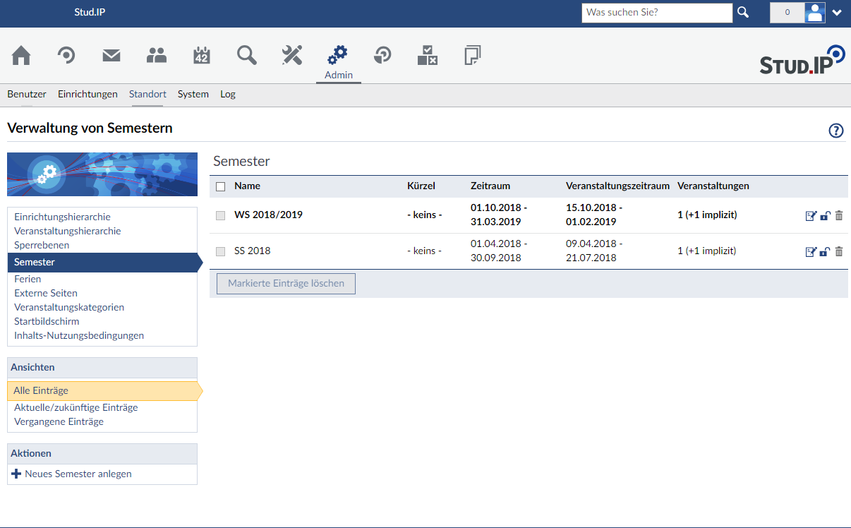 Die Semesterverwaltung dient zum Anlegen, zum Editieren oder zum Löschen von Studiensemester. Der Administrator erhält eine Übersicht, von angelegten Semestern mit den Start- und Endzeiten sowie die dazugehören Veranstaltungen.