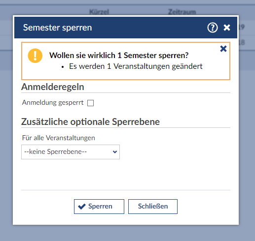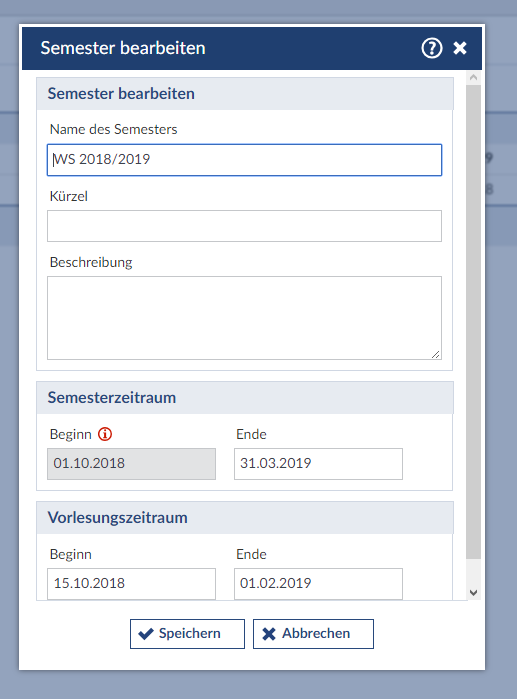 Sollten Sie einmal Start- oder Endzeiten eines Semester verändern wollen, so können sie diese Daten nur unter bestimmten Bedingungen verändern. Sollte zum einen das Startdatum bereits in der Vergangenheit liegen, ist es nicht mehr veränderbar. Zum anderen können Sie keine Semester löschen, wenn noch Veranstaltungen diesem Semester zugeordnet sind.