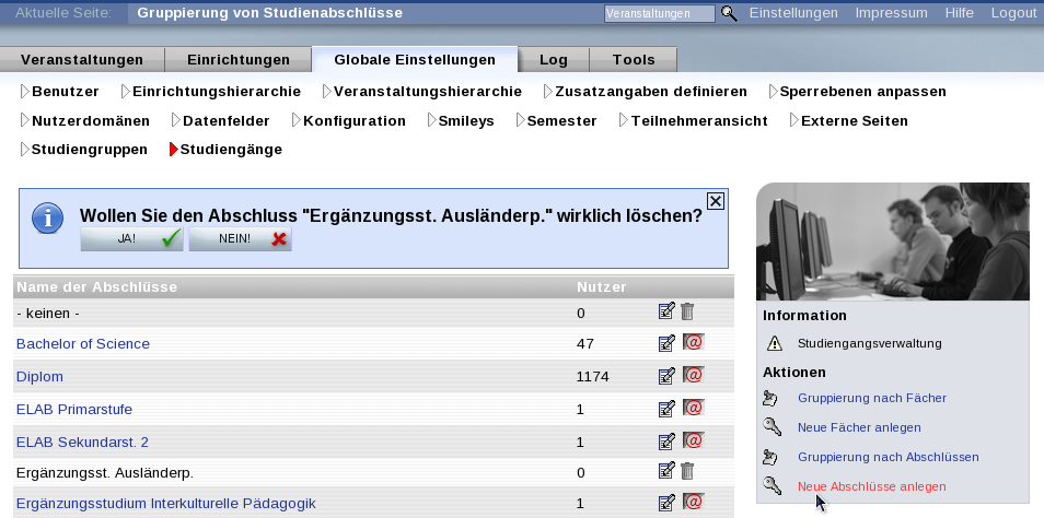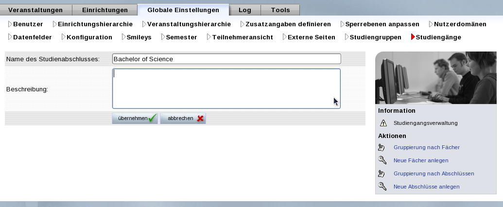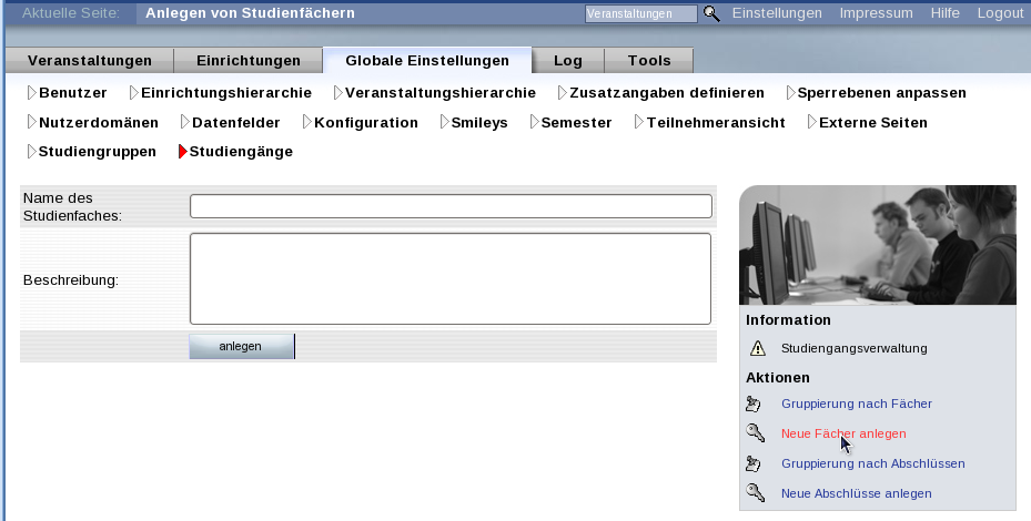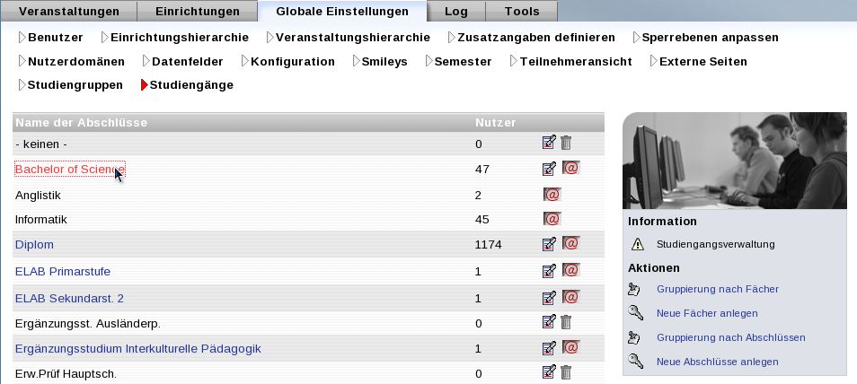 Sie gelangen zur Studiengangsverwaltung in dem Sie über Admin --> globale Einstellungen --> Studiengänge gehen.