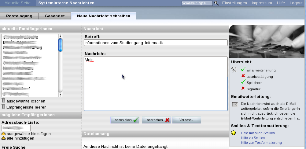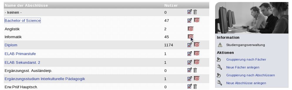 Hier lernen Sie das Verwalten und Anlegen von Fächern und Abschlüssen. Sie erhalten Übersichten über Studiengruppen aufgeteilt in Fach und Abschluss. Weiterhin ist das Versenden von Benachrichtigungen an einzelne Gruppen möglich.