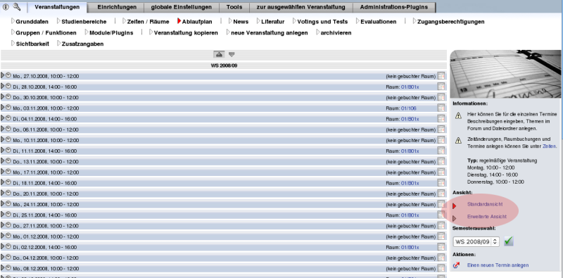 In der Administrationsansicht des Ablaufplans gibt es dann die Möglichkeit, die Ansicht zu wechseln.