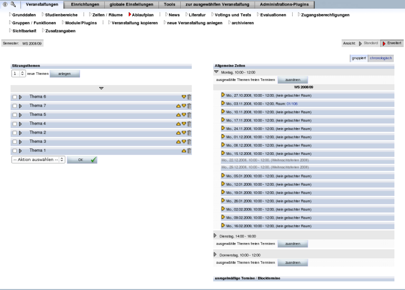 Wird diese Option eingeschaltet so steht die erweiterte Ansicht des Ablaufplans, die Themenverwaltung, zur Verfügung. In der Themenverwaltung ist es möglich, Themen getrennt von Terminen zu verwalten.Es können mehreren Themen einem Termin und ein Thema mehreren Terminen zugeordnet werden.