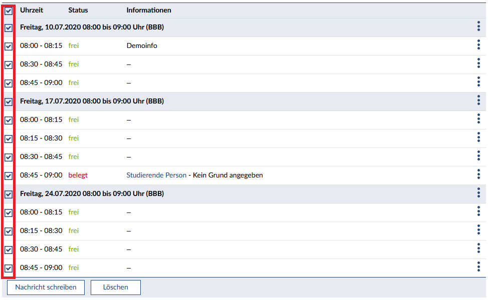 Auf der Übersichtsseite können Sie sowohl einzelne Termine als auch ganze Blöcke oder die ganze Seite auswählen. Setzen Sie dafür einen bzw. mehrere Haken an die entsprechenden Stellen.