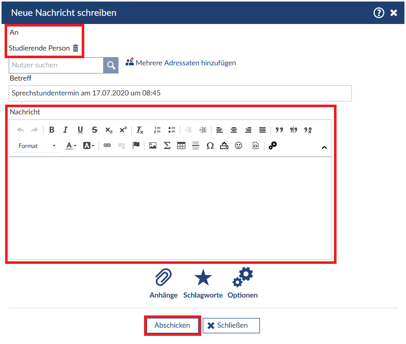 um die Nachricht an alle Adressaten zu verschicken. Nach erfolgreichem Versenden erscheint eine Systemmeldung.