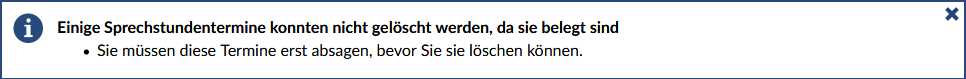 Enthielt Ihre Auswahl mindestens einen gebuchten Termin, erhalten Sie eine Information darüber. Die gebuchten Termine werden nicht gelöscht. Um gebuchte Termine zu löschen, müssen diese erst abgesagt werden.