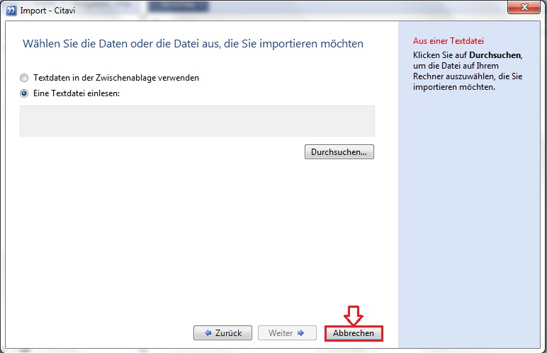 6. Im letzten Schritt klicken Sie bitte auf "abbrechen". Der Importfilter wurde nun zu Citavi hinzugefügt.