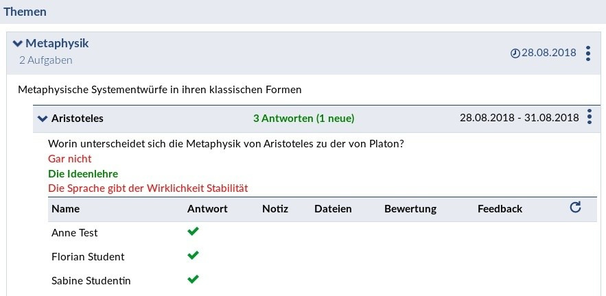 Ein Klick auf ein Thema zeigt Ihnen die dazugehörigen Aufgaben mit weiteren Informationen (z.B. Zahl der bisher abgegebenen Antworten). Die Sortierung erfolgt nach dem Sichtbarkeitsdatum (zeitlich absteigend).
