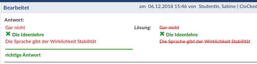 Zur Ansicht der einzelnen Antworten der Studierenden klicken Sie auf das entsprechende blaue Häkchen in der Spalte „Antwort“. So sieht bspw. die Antwort auf eine Single oder Multiple Choice-Frage aus: