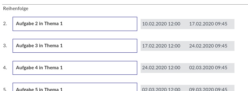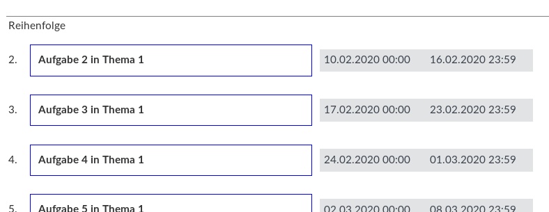 Wenn die "Aufgabe 2 in Thema 1" keiner Reihenfolgeposition zugeordnet wird, wird bei ihr auch kein Bearbeitungszeitraum eingetragen.