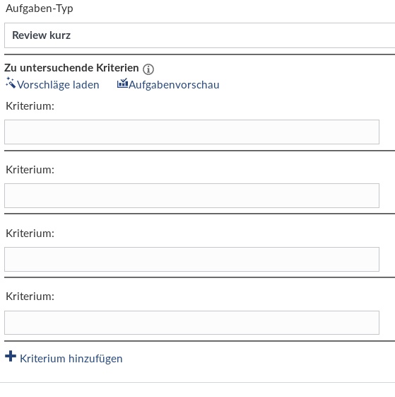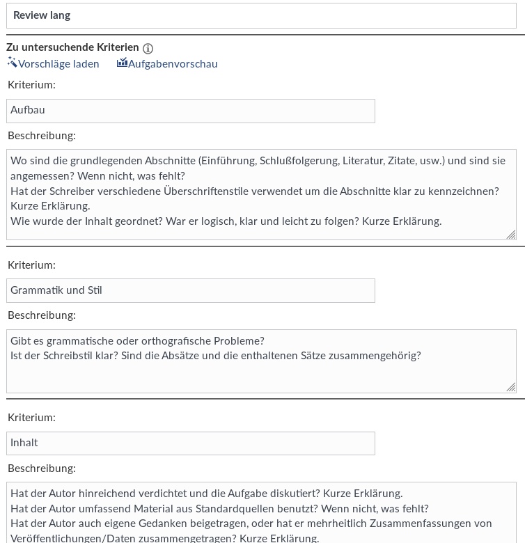 Bei dem Aufgabentyp "Review lang" geben Sie zusätzlich zu den Kriterien vor, welche Punkte genau zu betrachten sind und wonach zu suchen ist. Die Studierenden müssen dann anhand dieser Kriterien mit einem frei geschriebenen Text antworten.