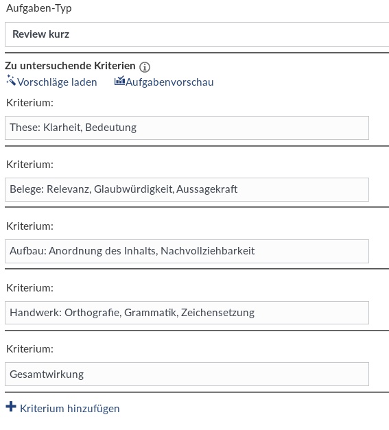 Für beide Review-Aufgabentypen können Sie Vorschläge laden und nach Belieben ändern.