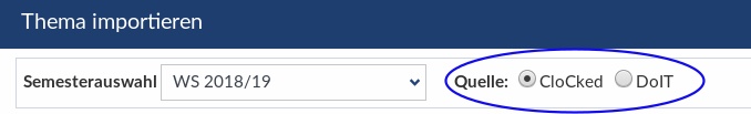 Beim Import eines Themas erfolgt zuerst die Festlegung, aus welchem Semester und aus welcher Anwendung die Themen importiert werden sollen. Es stehen CloCked und DoIT zur Verfügung.