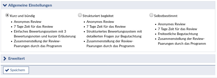 Da sich die Einstellmöglichkeiten beim Peer-Review-Verfahren untereinander beeinflussen und den Review-Prozess steuern, wurden verschiedene Szenarien gebildet. Aufgrund der didaktischen Zielsetzung wählen Sie ein Szenario aus, und die entsprechenden Einstellungen werden automatisch vorgenommen.