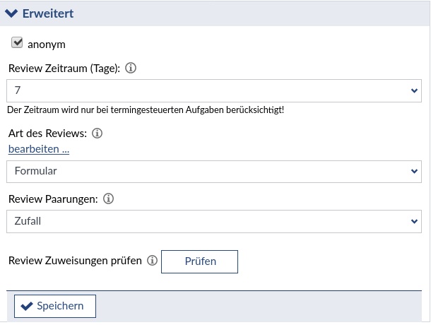 Anonym: Standardmäßig ist diese Funktion aktiviert und bedeutet "beidseitig anonym": die Beteiligten wissen nicht, von wem die Aufgabenlösung oder das Review ist. Nur den Lehrenden werden die Namen angezeigt.
