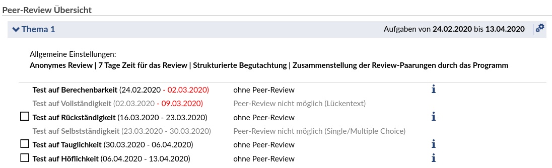 - Für die erste Aufgabe in der Liste ist grundsätzlich eine Peer-Review möglich, da die Bearbeitungszeit aber abgelaufen ist kann es nicht mehr aktiviert werden.
