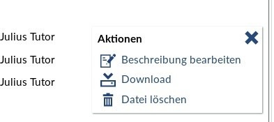 Die Liste der Dateien bietet Bearbeitungsfunktionen, die abhängig von den Berechtigungen in Stud.IP sind. Das obige Beispiel zeigt die Dateiliste für eine Aufgabe aus Sicht der Lehrenden. Die Teilnehmenden bekommen die Liste so dargestellt: