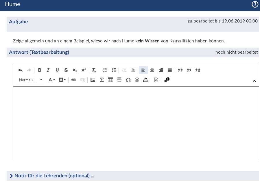 Wenn eine Aufgabe mit einem eigenen Text beantwortet werden soll, sieht das Bearbeitungsfenster so aus: