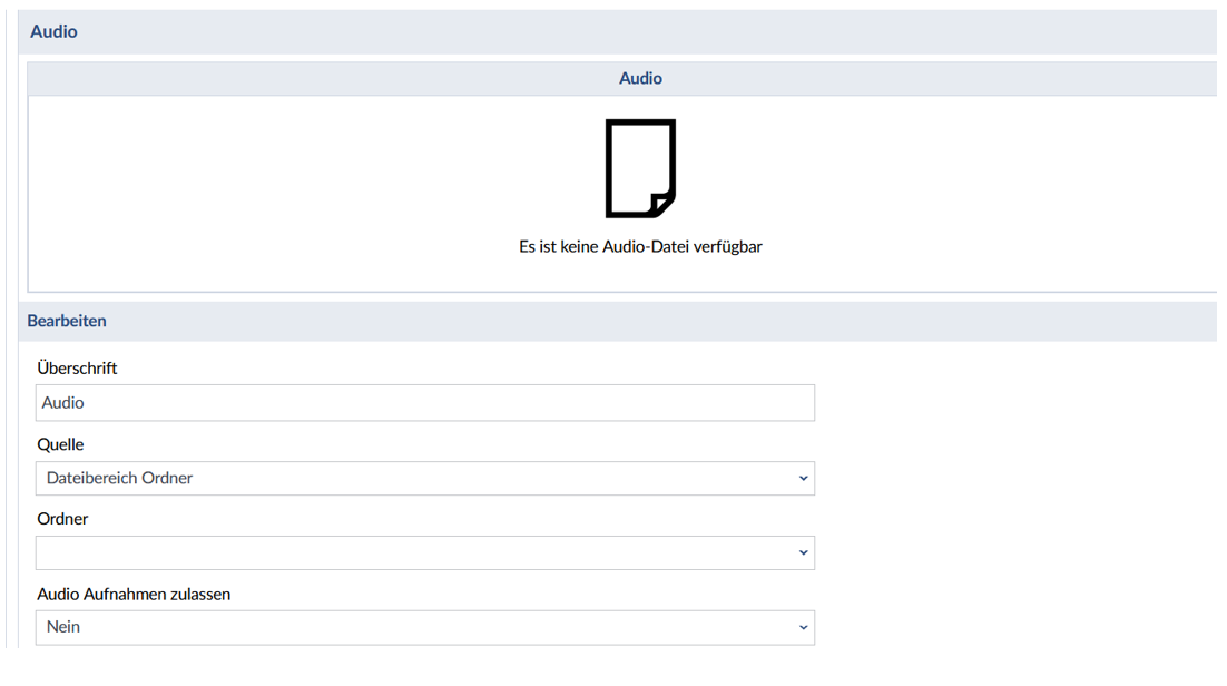 Bitte beachten: Die Audiodatei muss zuvor in Stud.IP bereits in einem Dateibereich hochgeladen worden sein. Es lassen sich an dieser Stelle keine Dateien direkt vom PC hochladen.