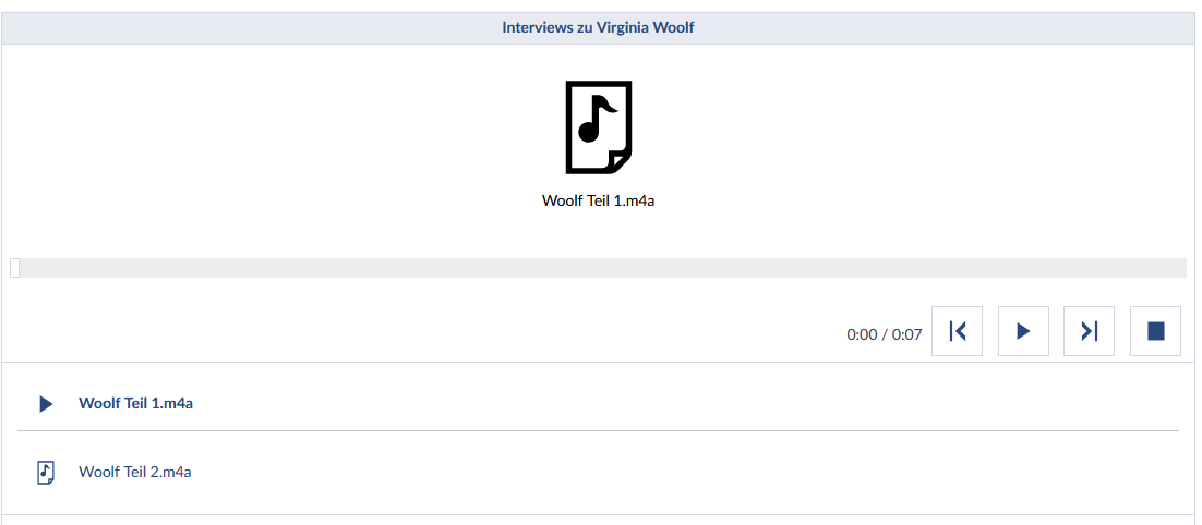 Im Audio-Block kann eine Audiodatei aus dem Dateibereich oder von einer externen URL in Courseware eingebunden werden. Der Courseware-Audio-Player ermöglicht die Funktionen Play, Pause und Stop. Vor- und zurückspulen ist über die Fortschrittsanzeige möglich.
