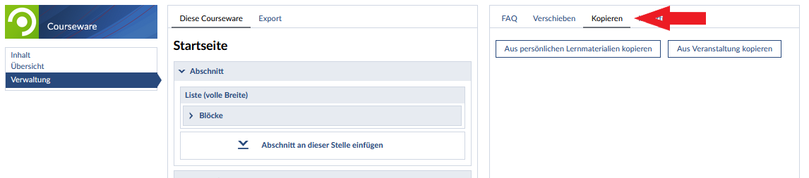 Um Inhalte aus der aktuellen Veranstaltung oder einer anderen Veranstaltung oder auch aus Ihrem Arbeitsplatz in die aktuelle Courseware zu kopieren, wechseln Sie in der Verwaltungsansicht im rechten Seitenbereich in den Reiter Kopieren. Wählen Sie anschließend zwischen den Optionen Aus persönlichen Lernmaterialien kopieren (Arbeitsplatz) oder Aus Veranstaltung kopieren