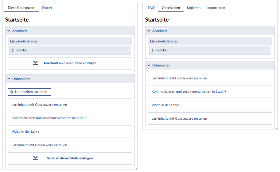 In der Ansicht zum Verschieben von Inhalten wird Ihnen zunächst Ihre aktuelle Courseware-Struktur in zwei Bereichen nebeneinander angezeigt, da Sie beim Verschieben von rechts nach links verschieben werden. Die Ansicht zum Kopieren ist analog aufgebaut, jedoch wählen Sie dort zunächst die Veranstaltung aus, aus welcher Sie Inhalte kopieren möchten.