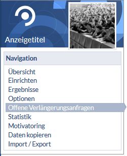Sobald eine Anfrage vorliegt, erscheint in der Navigation der Menüpunkt "Offene Verlängerungsanfragen". Zusätzlich bekommen Sie eine Stud.IP interne Nachricht, in der Sie von der Anfrage informiert werden.