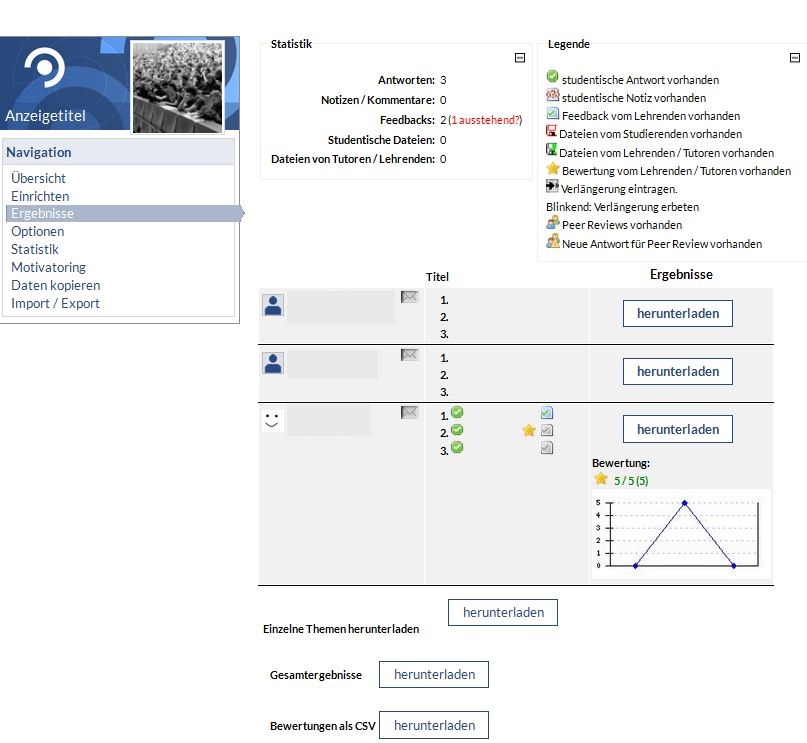 Für die Sicherung der Ergebnisse oder zur weiteren Verarbeitung können Sie die Gesamtergebnisse zu einem Thema oder die Ergebnisse bestimmter Kursteilnehmer herunterladen.