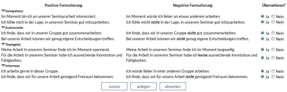 In der Ansicht der Standard-Fragen wählen Sie aus, welche Fragen angelegt werden sollen. Wählen Sie dazu "ja" für "anlegen" aus und "nein" für das "Nichtanlegen".
