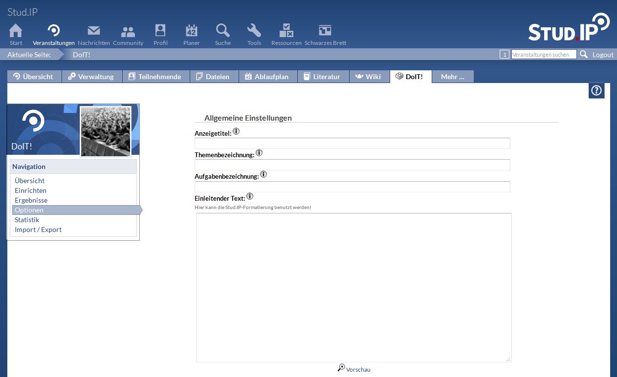 Bevor Sie eine DoIT-Aufgabe stellen, sollten Sie grundsätzliche Einstellungen von Ihrem DoIT ändern, damit die Studierenden schneller erkennen können womit sich das DoIT in der Veranstaltung befasst. Auf der DoIT-Seite finden Sie in der Navigation den Menüpunkt "Optionen".