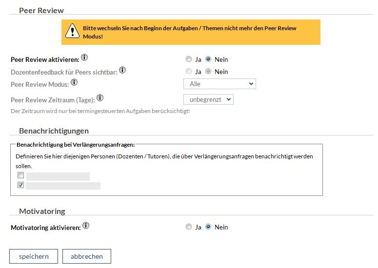 Peer Review: Das Peer Reviewing ist für Studierende eine Möglichkeit, sich gegenseitig bewerten zu können. Einerseits kann dies den Dozenten entlasten, sobald eine sehr große Teilnehmerzahl vorhanden ist, andererseits erhalten alle Teilnehmer Rückmeldungen von ihren Kommilitonen. Für das Peer Reviewing stehen Ihnen vier verschiedene Möglichkeiten zur Verfügung:
