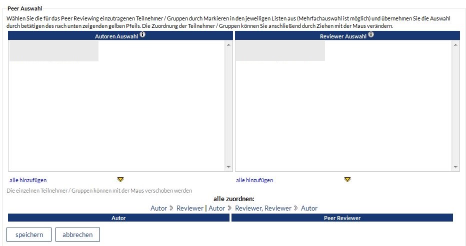 Im Modus Paarungen entscheidet der Dozent/Tutor, welcher Teilnehmer einen bestimmten anderen bewerten darf. Hierbei bekommen Sie zwei Auswahllisten, die durch Anklicken auf den jeweils darunter befindlichen gelben Pfeil den gewählten Eintrag in die untere Liste befördert. Dort können die Einträge beliebig verschoben oder wieder gelöscht werden.