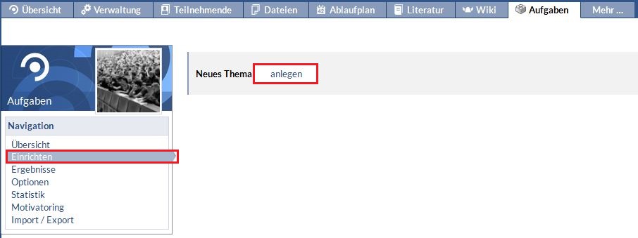 Ein neues Thema legen Sie an, indem Sie in dem Navigationsmenü "Einrichten" auswählen und auf der Seite, die erscheint "anlegen" auswählen.