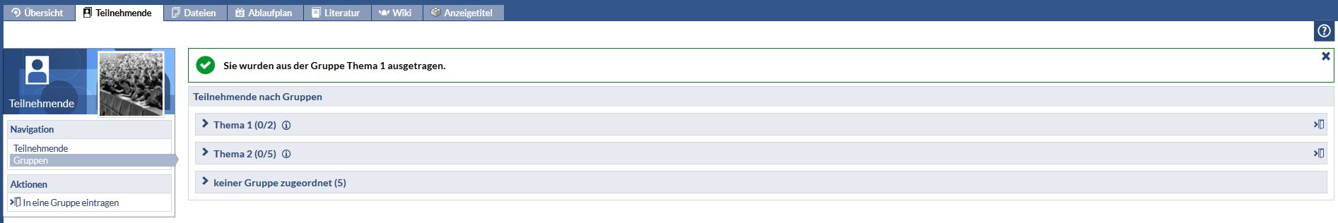 Nach dem Auswählen einer Gruppe, erhalten Sie in der Übersicht einen Hinweis mit der Information, welcher Gruppe Sie zugeordnet sind.
