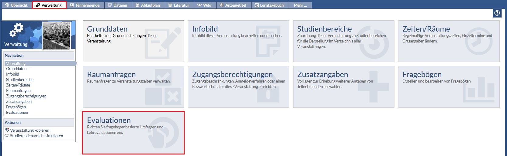 Sie müssen sich auf der Administrierungsseite der Veranstaltung befinden, in der Sie die Evaluation veröffentlichen wollen. Dort klicken Sie auf den Unterpunkt Evaluationen.