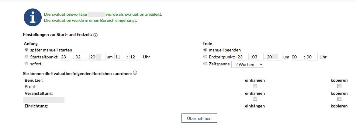 • Sie können entscheiden wann und wie lange die Evaluation laufen soll. Sie legen einen Anfangszeitpunkt fest bzw. starten später manuell und einen Endzeitpunkt bzw. beenden manuell.