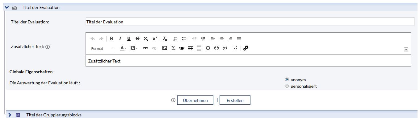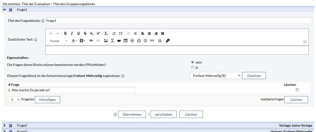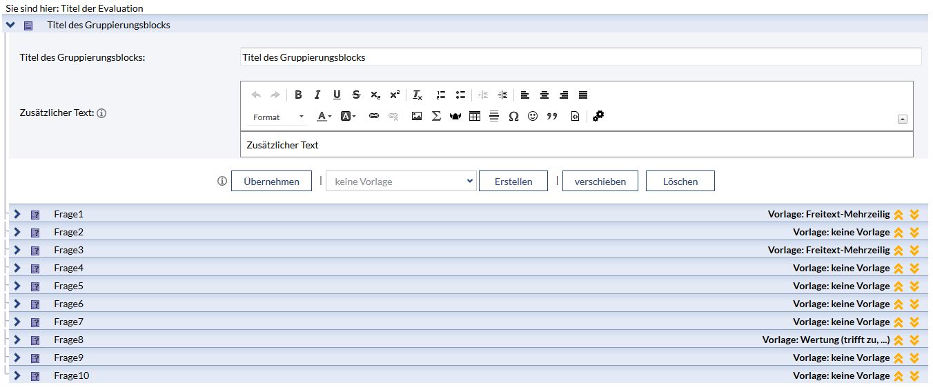Die zweite Ebene der Evaluation sind die Gruppierungsblöcke. Gruppierungsblöcke selbst enthalten keine Fragen und sind eher eine Art Container, die die Fragenblöcke enthalten. Gruppierungsblöcke strukturieren die Evaluation vor. In Gruppierungsblöcken können entweder Fragenblöcke oder Untergruppierungsblöcke enthalten sein. Niemals beides. Fragenblöcke sind also immer die letzten Ebenen.