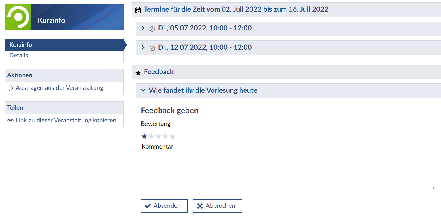 - allgemeines Feedback (eigener Bereich auf der Übersichtsseite Ihrer Veranstaltung)