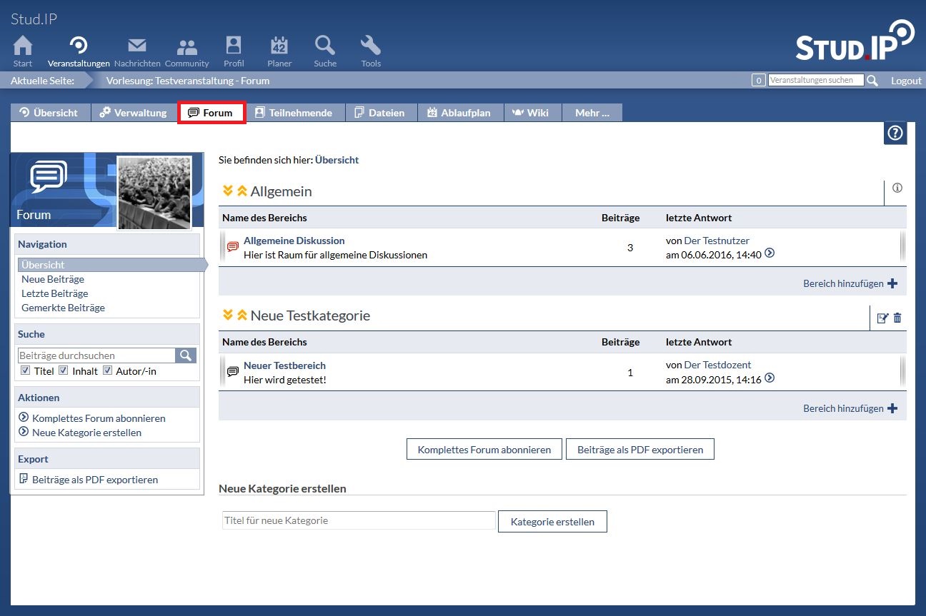Sie selbst haben jetzt drei Möglichkeiten. Sie können aktiv in der Diskussion teilnehmen, indem Sie Ihre Meinung kundtun. Klicken Sie hierzu auf „Antworten“. Zusätzlich können Sie das jeweilige Thema abonnieren, um eine Stud.IP-interne Nachricht zu erhalten, falls ein neuer Beitrag in dem Bereich verfasst wurde. Klicken Sie hierzu auf „ Dieses Thema abonnieren “. Zuletzt haben Sie die Möglichkeit die verfassten Beiträge als PDF zu exportieren, indem sie auf „Beiträge als PDF exportieren“ klicken.